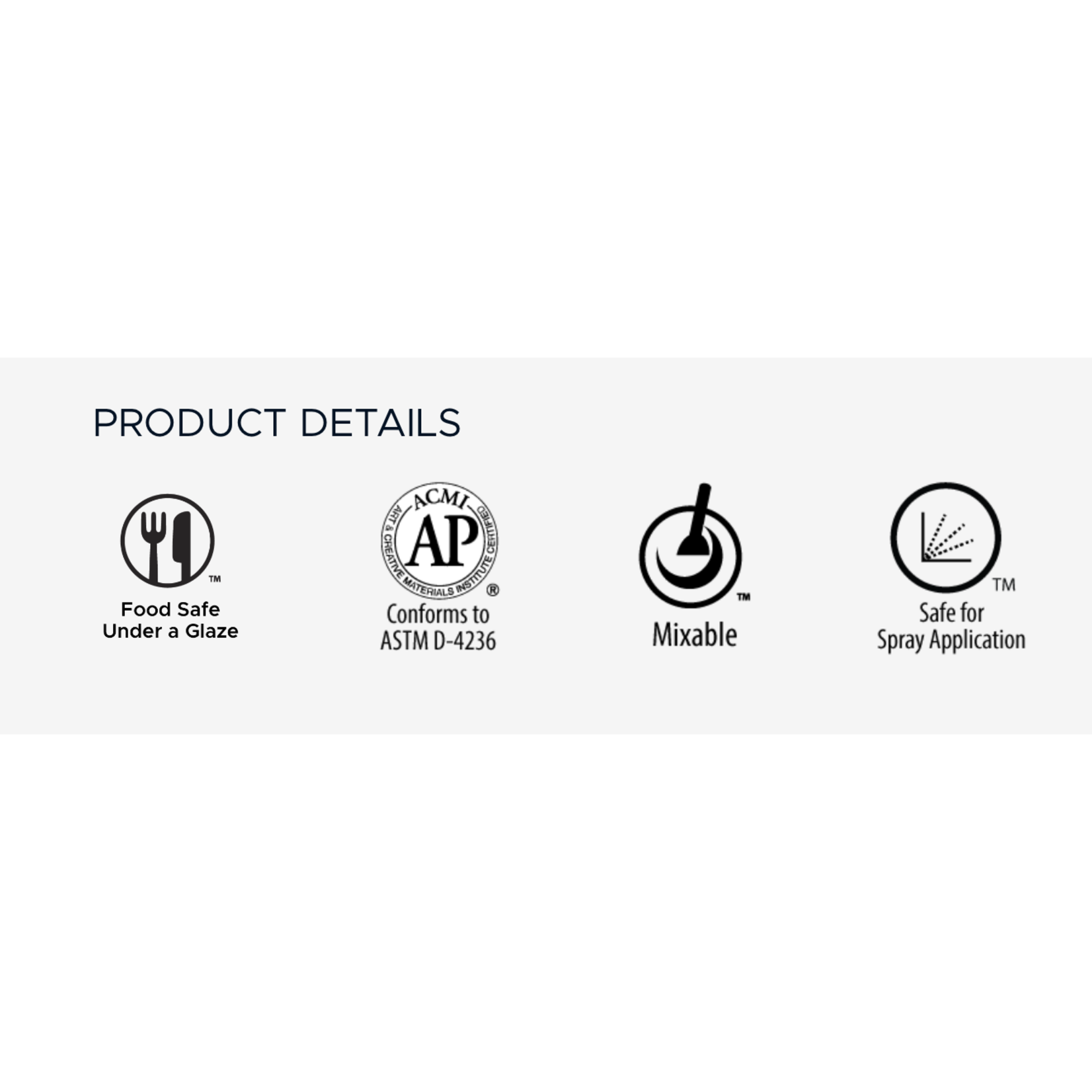Try two finish possibilities: When left unglazed these colors have the rich textural appearance of velvet; when covered with AMACO Clear Transparent Matte or Clear Gloss they intensify in color. Can be easily applied to wet clay, greenware, or mature Cone 04 bisque (1971F / 1077C)